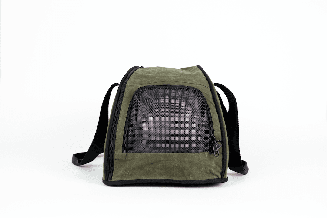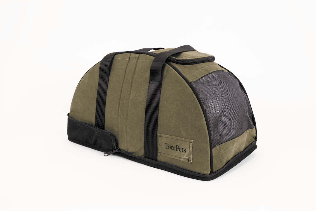 This collapsible tote carrier specifically designed for the convenience of storage by TotePets™ is made of 70’s repurposed vintage army shelters.