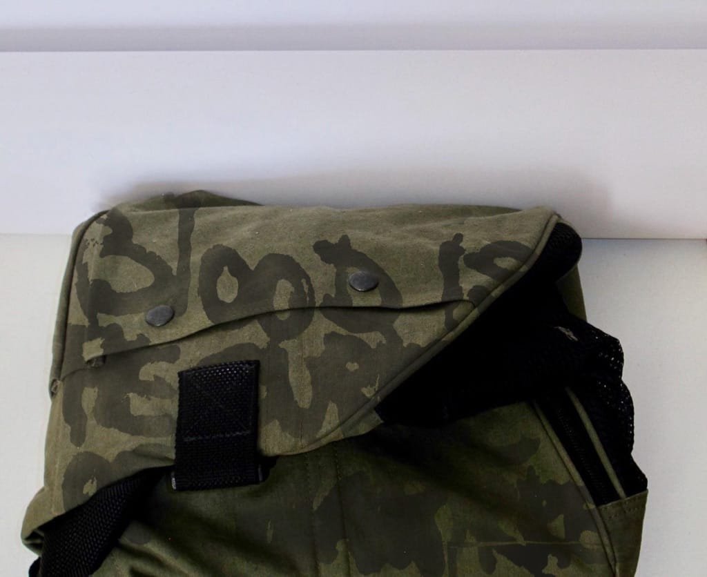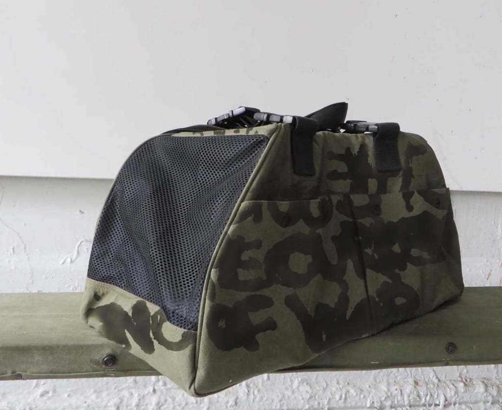 This collapsible tote carrier specifically designed for the convenience of storage by TotePets™ is made of 50’s repurposed vintage army shelters. Graffiti by Tunji Dada™