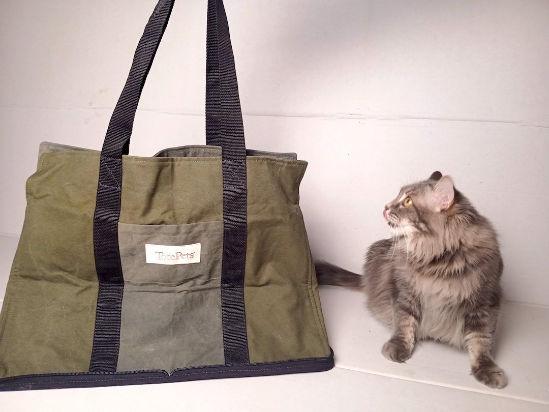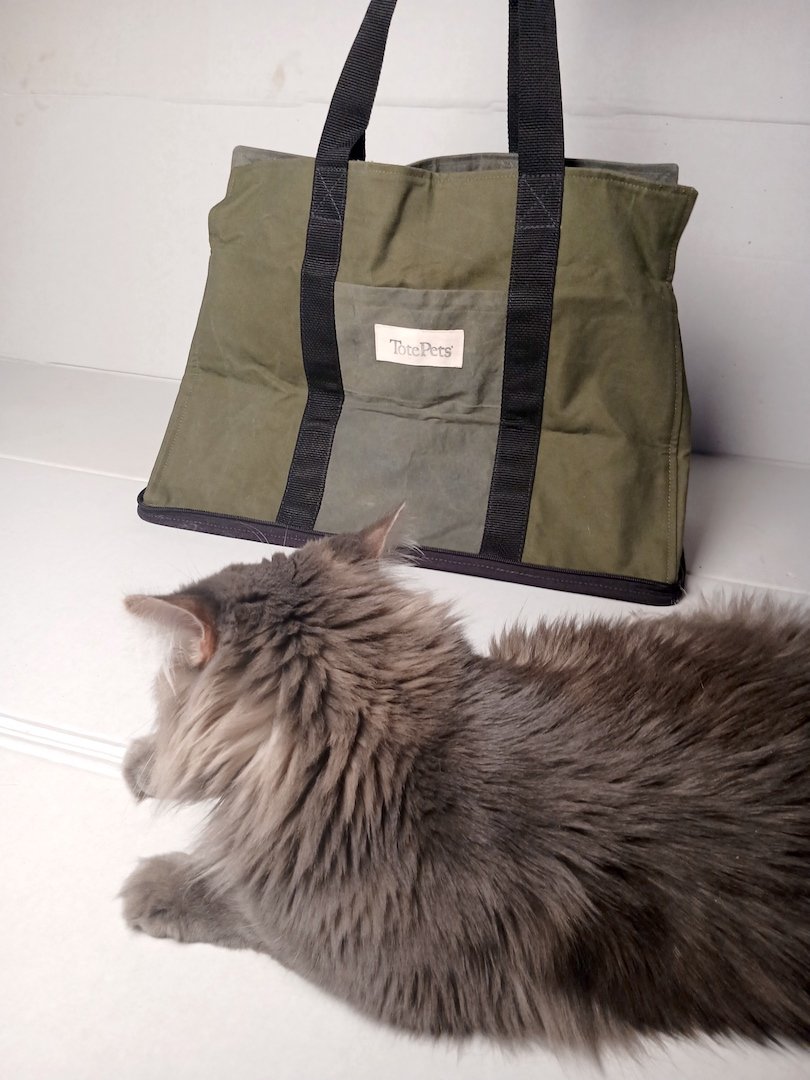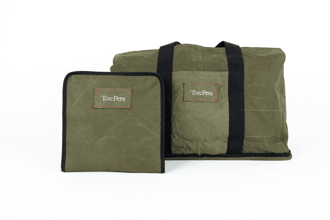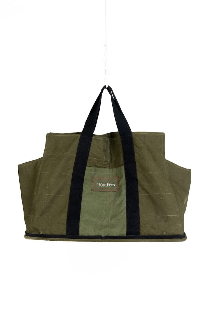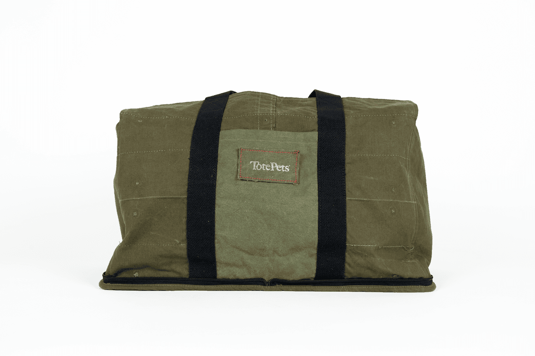 This TotePets™ Stowe Away Tote carrier specifically designed for the convenience of storage by TotePets™ is made of 50’s repurposed vintage army shelters. Mismatch Stock materials.